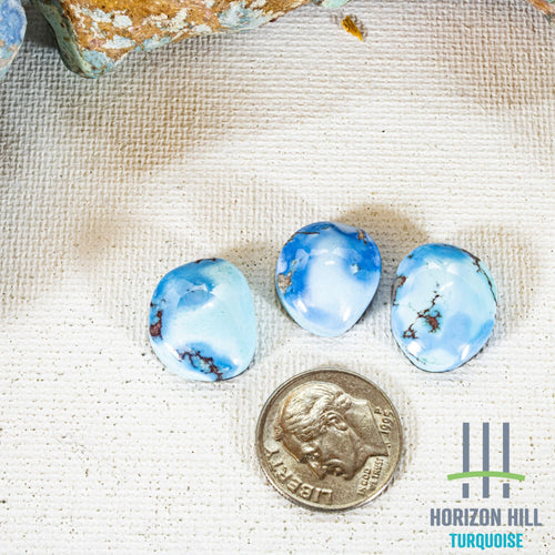 Golden Hill turquoise was first introduced to the U.S. around 2014. Mined in Kazakhstan, and only in the winter months, Golden Hill has become sought after and considered rare. It is a natural and chemically pure turquoise with colors that range from light blue to deep lavender. The matrix is a stunning complement with shades of brown, rust, and red. Most of our Golden Hill cabochons are freeform to help preserve as much of the rough material as possible. Working with Golden Hill is a genuine pleasure as the colors in the material are revealed with each step in the cabbing process. Golden Hill is a great example of why turquoise is so captivating.