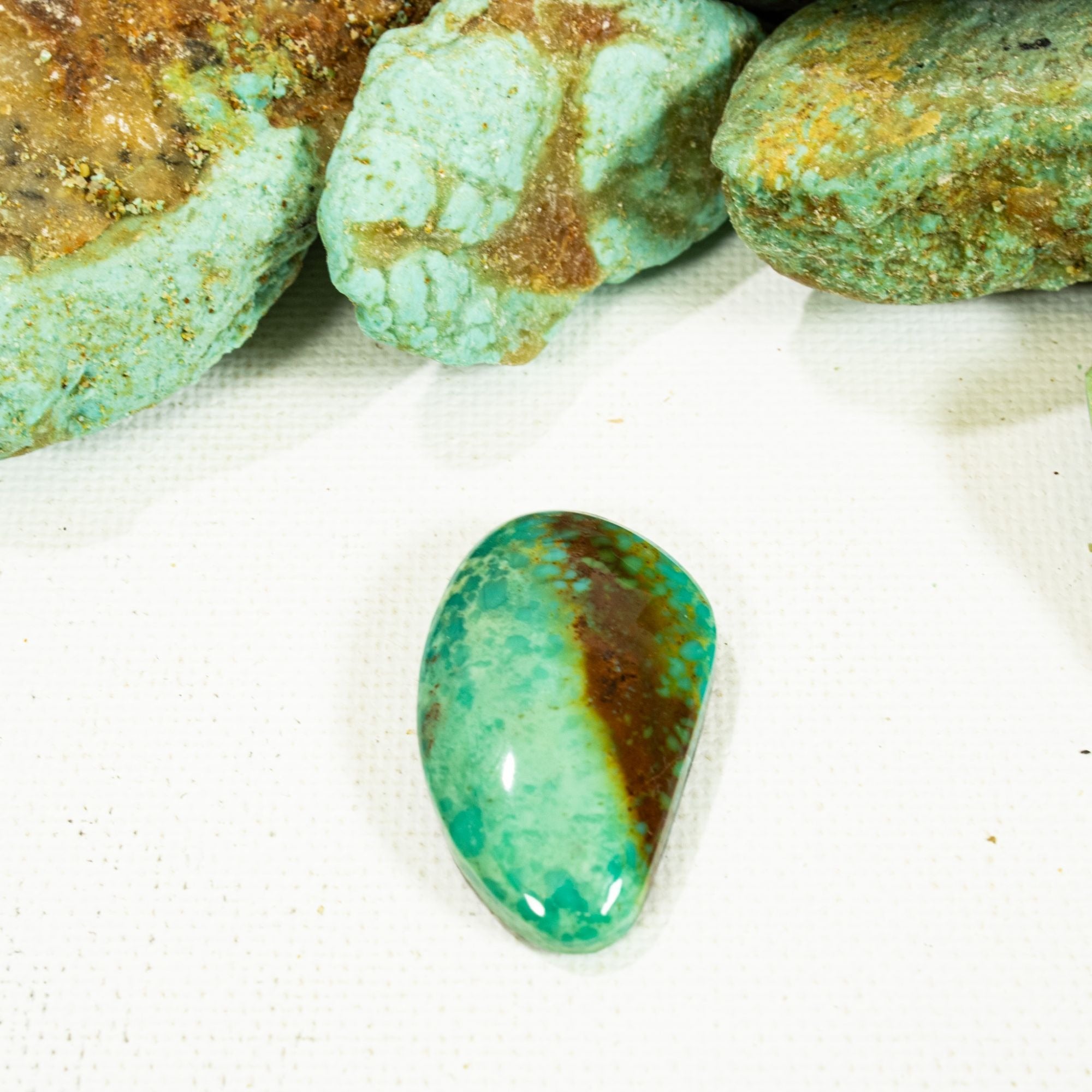 Patagonia Turquoise is found in southeast Arizona and has become very popular and in demand. The color is spectacular and will range from blue to green and a full range of hues in between. The matrix is often a pleasing warm and complimentary caramel color. This single cab is a beautiful example of a rich, deep blue green Patagonia shade with its signature caramel and red matrix.