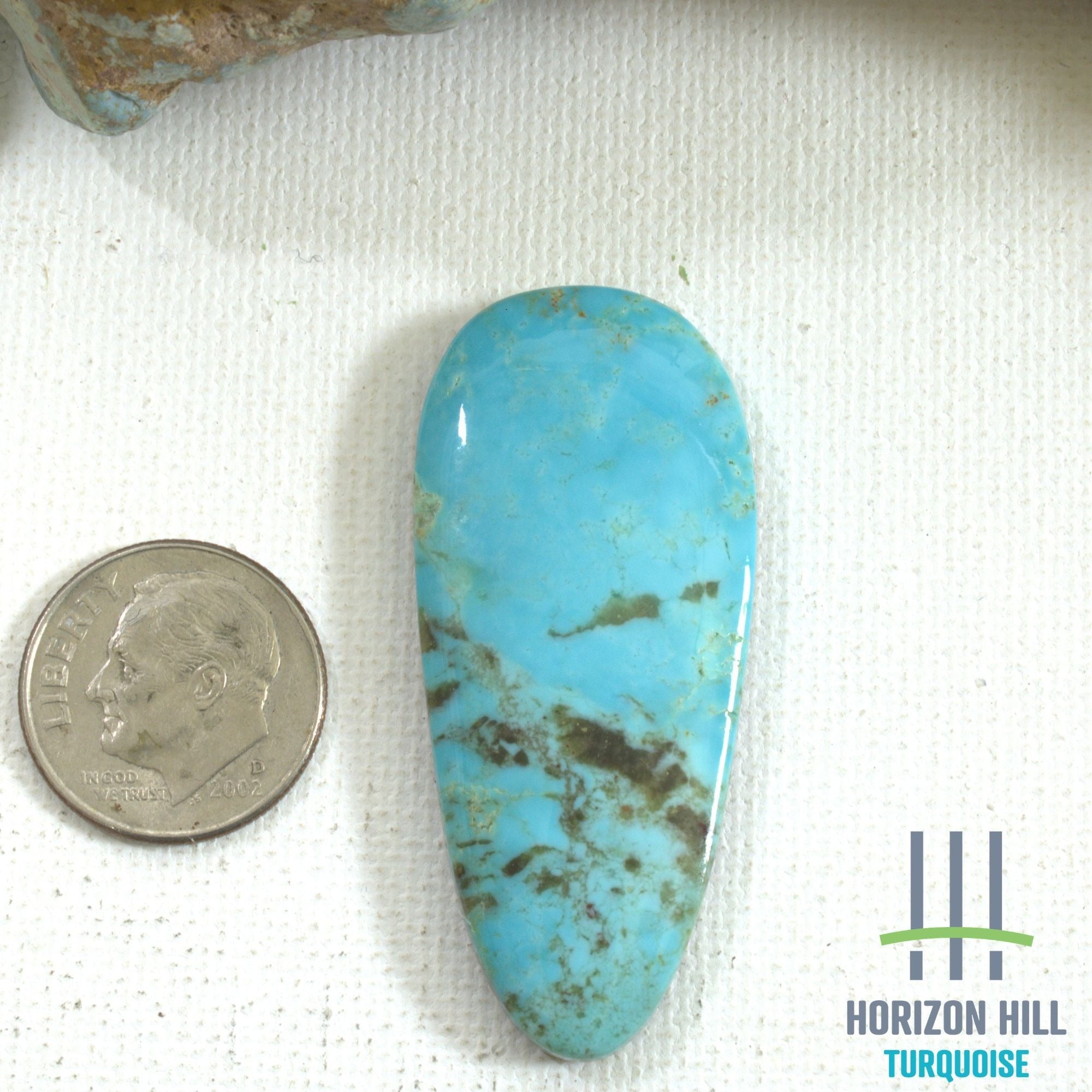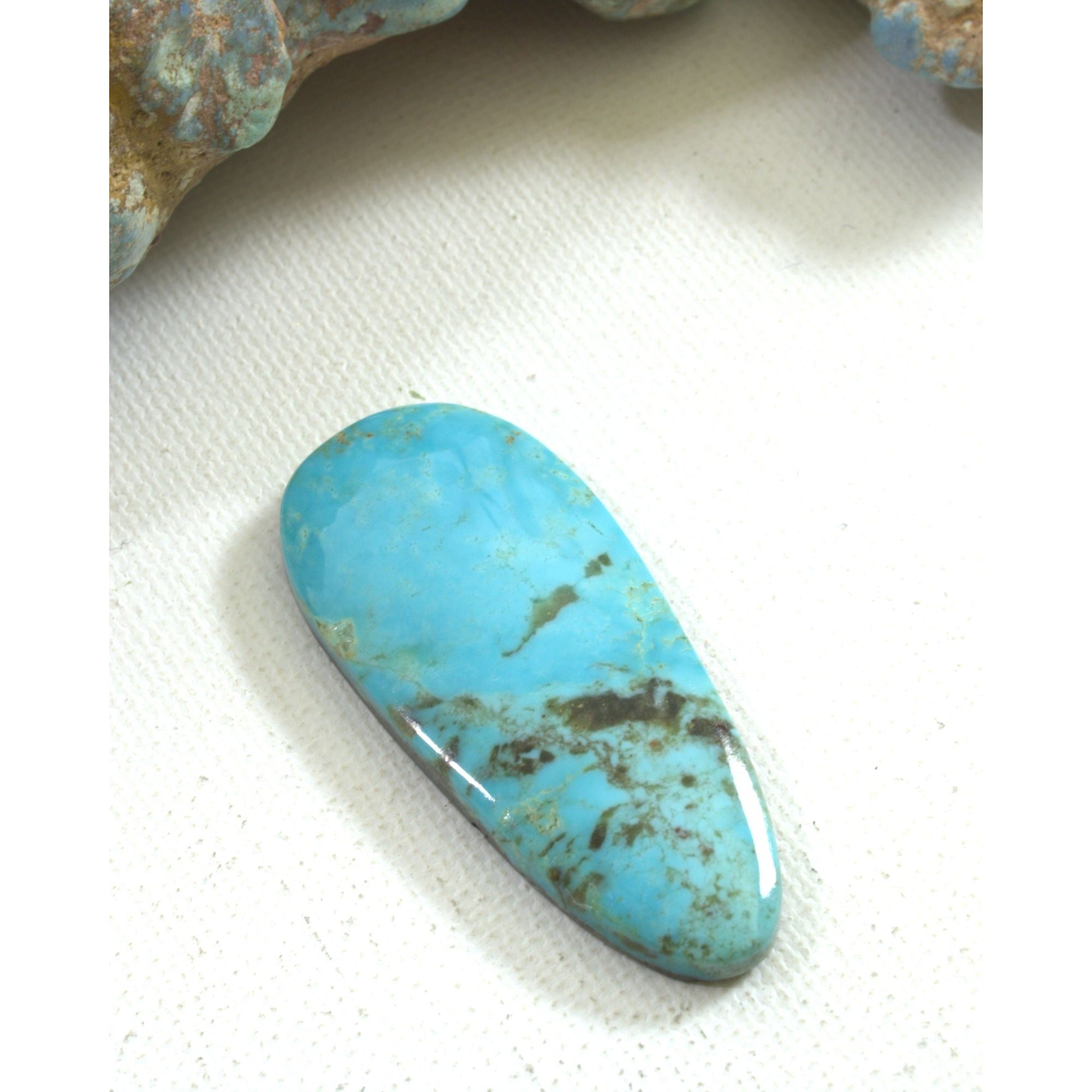 Patagonia Turquoise is found in southeast Arizona and has become very popular and in demand. The color is spectacular and will range from blue to green and a range of hues in between. The matrix is often a pleasing warm and complimentary caramel color. This is a unique Patagonia cab from the Stella Blue mine. It presents an unusual and eye catching Patagonia deep blue/green and ticks of the classic caramel matrix.