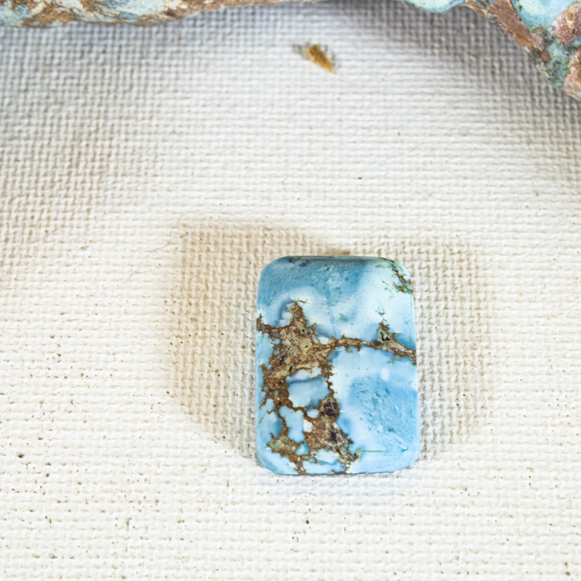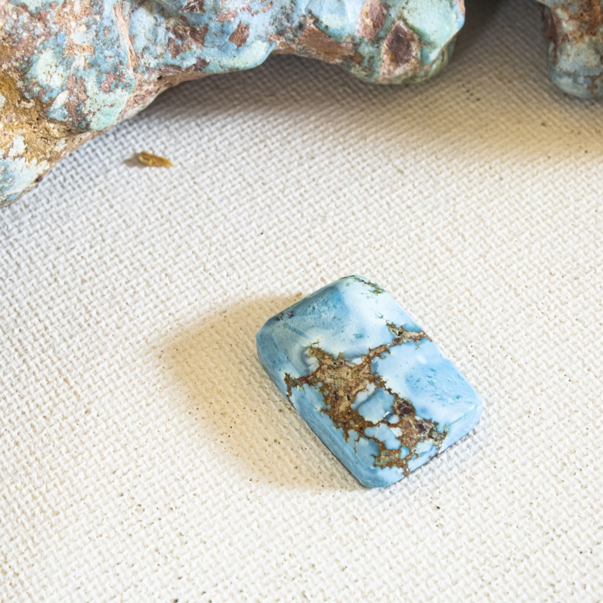 Golden Hill turquoise was first introduced to the U.S. around 2014. Mined in Kazakhstan, and only in the winter months, Golden Hill has become sought after and considered rare. It is a natural and chemically pure turquoise with colors that range from light blue to deep lavender. This is a beautiful presentation of Golden Hill lavender and blue color with the classic caramel matrix.