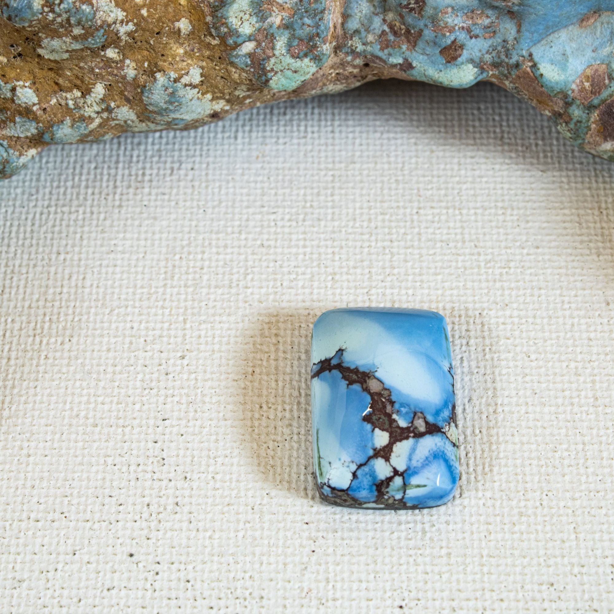 Golden Hill turquoise was first introduced to the U.S. around 2014. Mined in Kazakhstan, and only in the winter months, Golden Hill has become sought after and considered rare. It is a natural and chemically pure turquoise with colors that range from light blue to deep lavender. This is a beautiful presentation of Golden Hill lavender and blue color with the classic caramel matrix.