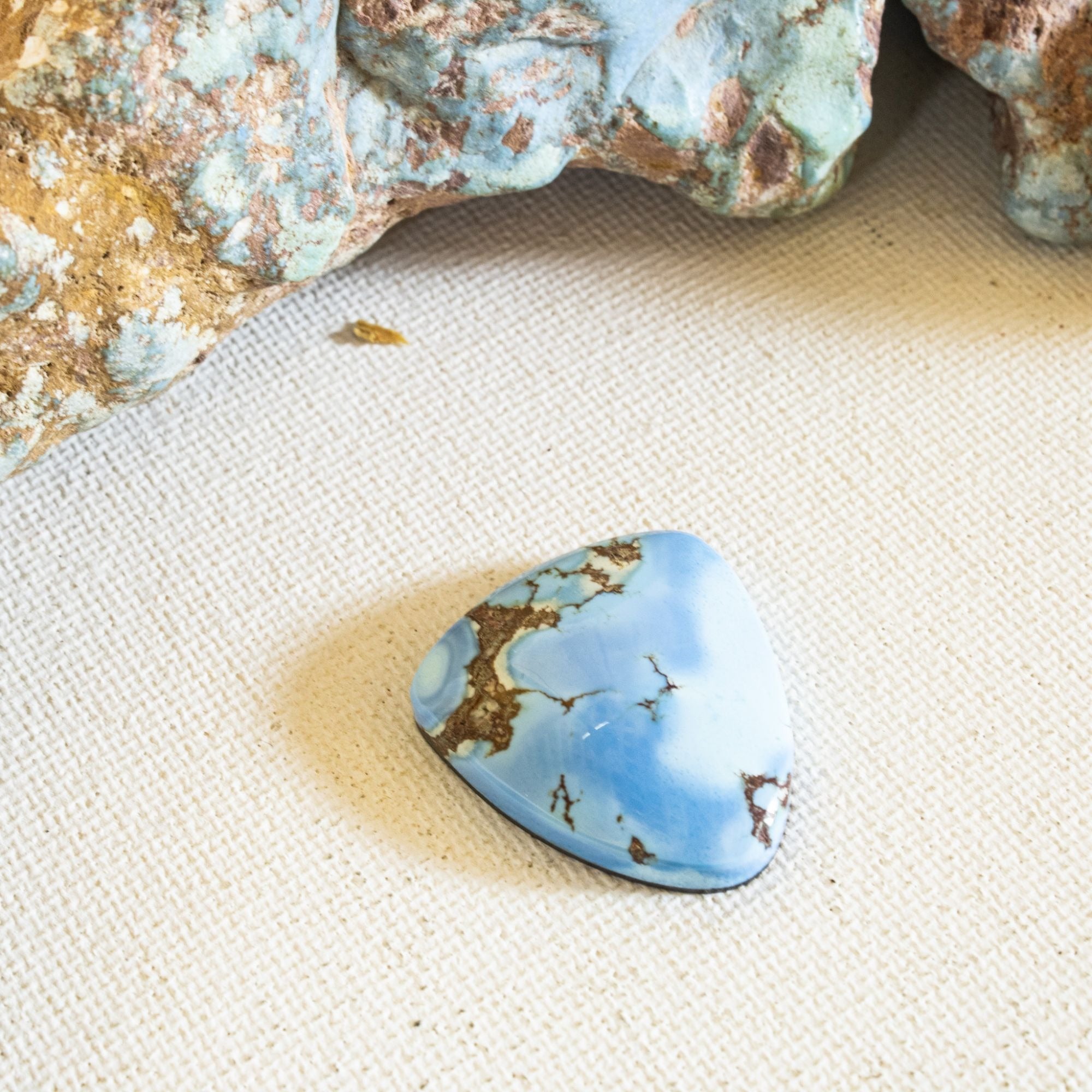 Golden Hill turquoise was first introduced to the U.S. around 2014. Mined in Kazakhstan, and only in the winter months, Golden Hill has become sought after and considered rare. It is a natural and chemically pure turquoise with colors that range from light blue to deep lavender. This is a beautiful presentation of Golden Hill lavender and blue color with the classic caramel matrix.
