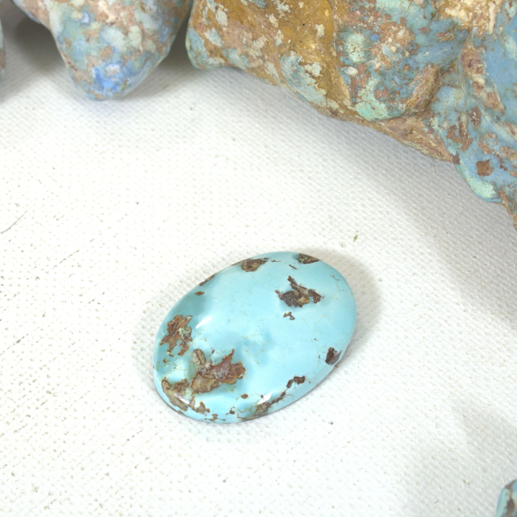 Golden Hill turquoise was first introduced to the U.S. around 2014. Mined in Kazakhstan, and only in the winter months, Golden Hill has become sought after and considered rare. It is a natural and chemically pure turquoise with colors that range from light blue to deep lavender. This is a great Golden Hill cab with terrific color and matrix.