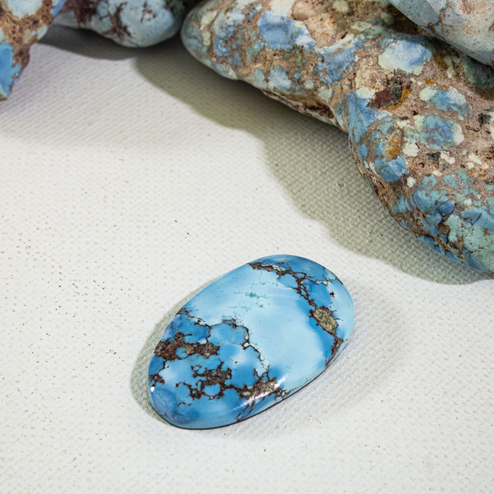 Golden Hill turquoise was first introduced to the U.S. around 2014. Mined in Kazakhstan, and only in the winter months, Golden Hill has become sought after and considered rare. It is a natural and chemically pure turquoise with colors that range from light blue to deep lavender. This is a fabulous Golden Hill cab with a unique placement of the classic Golden Hill lavender/blue color and caramel matrix.