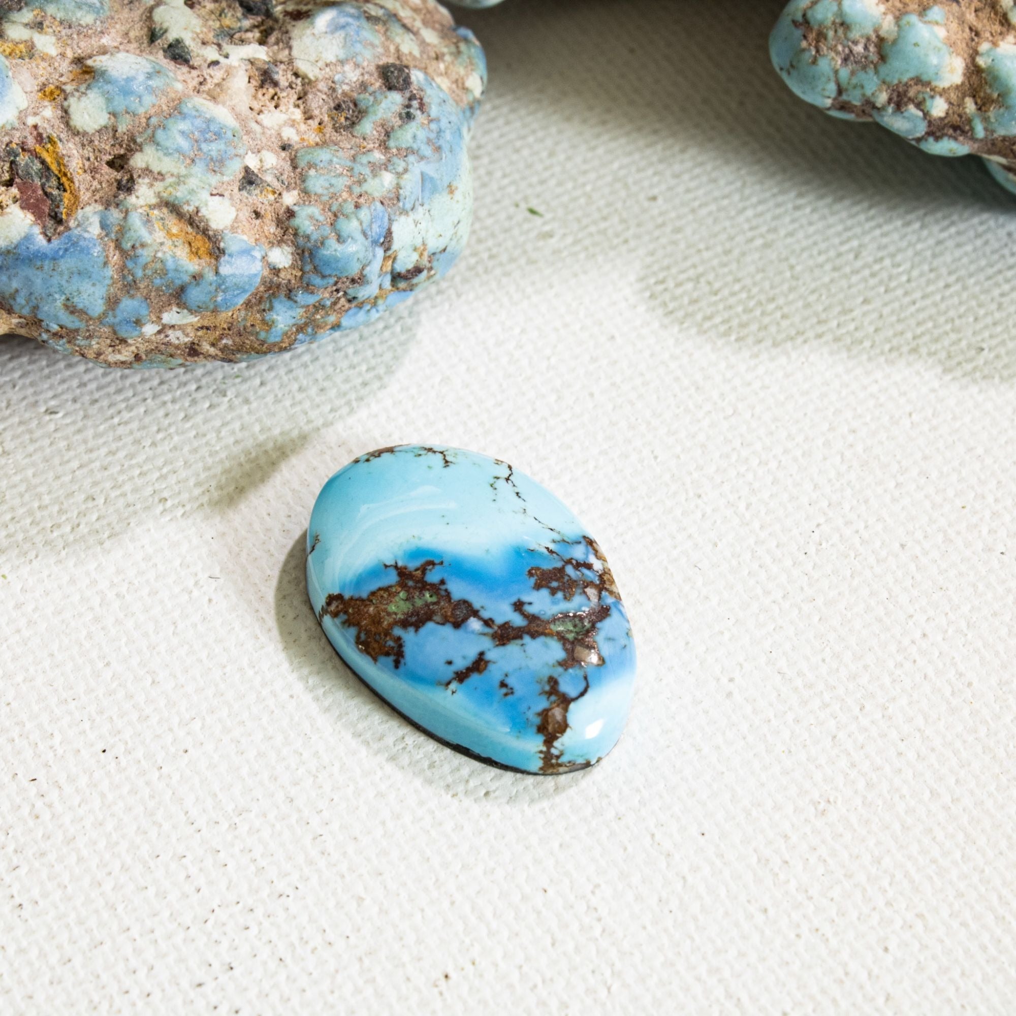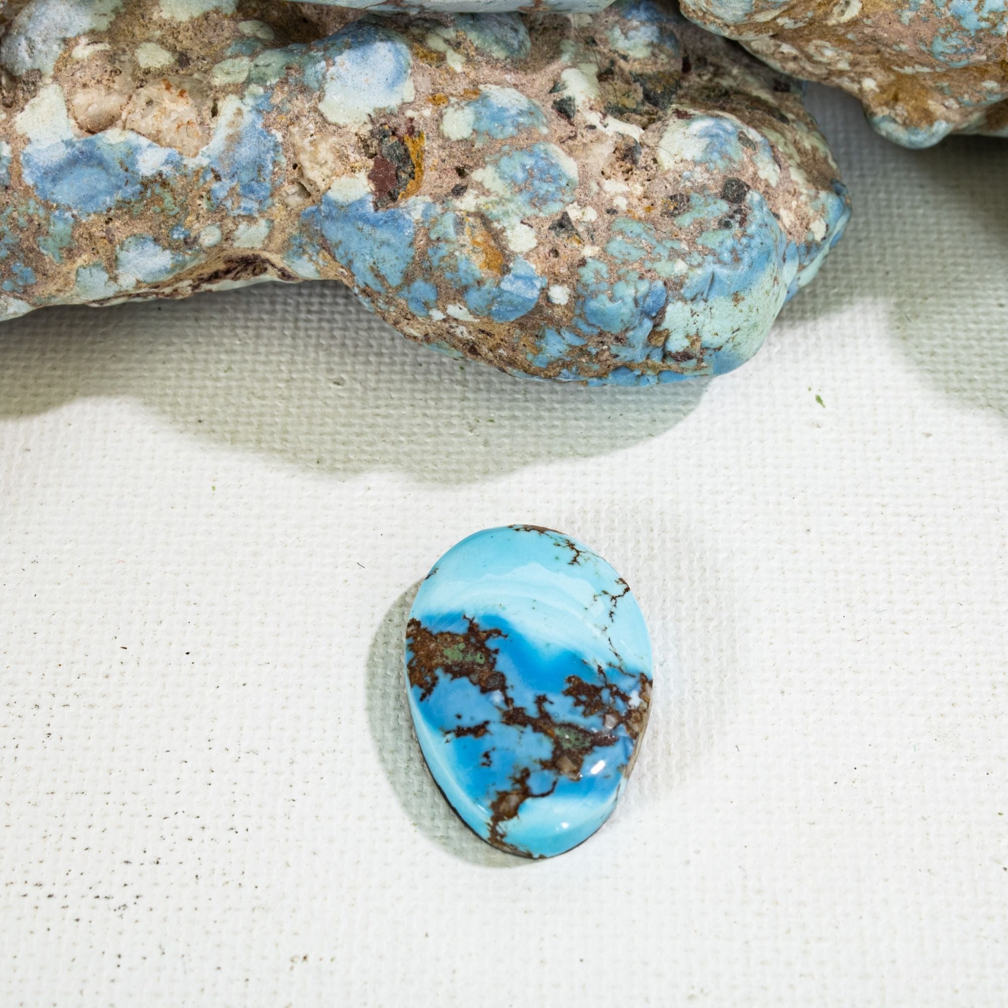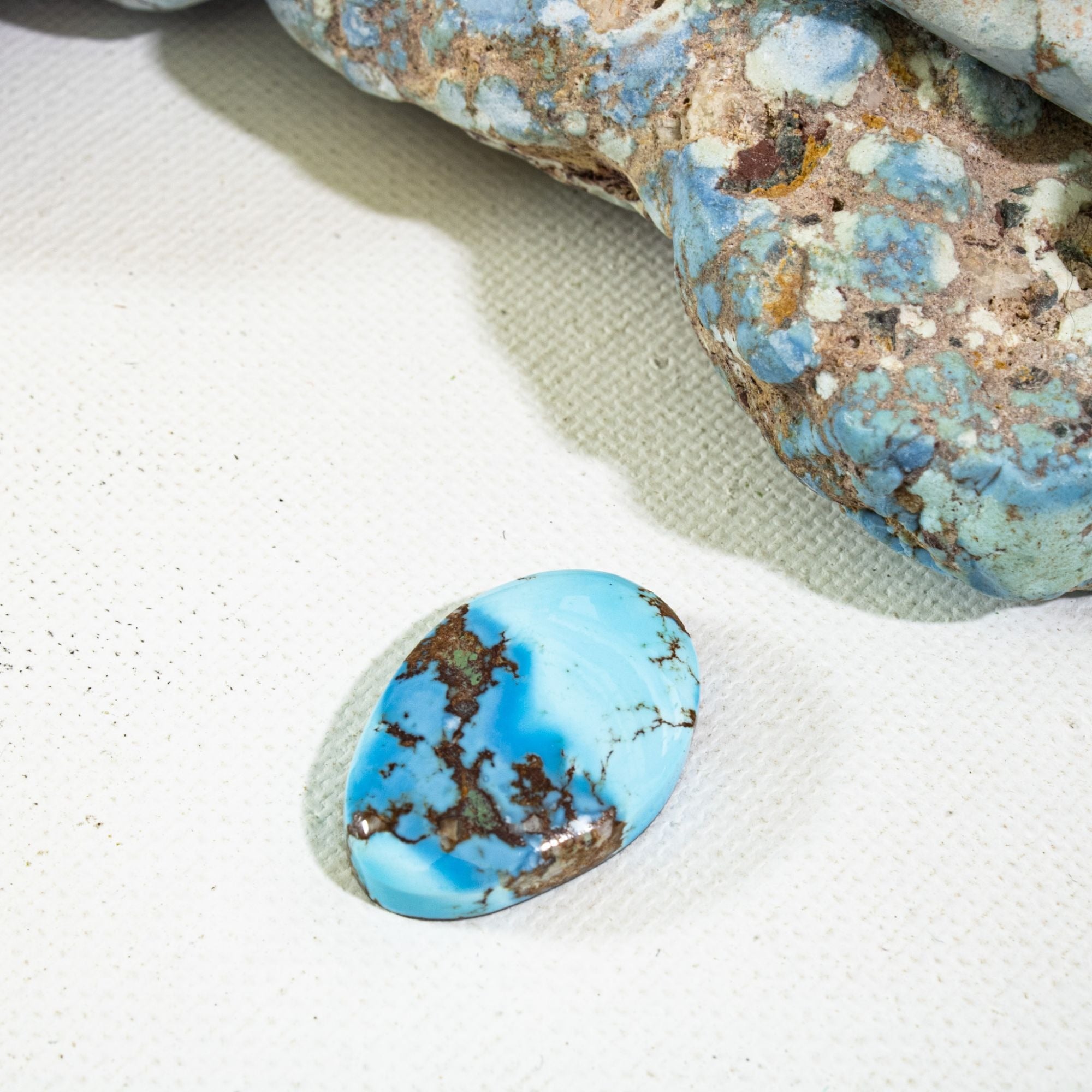 Golden Hill turquoise was first introduced to the U.S. around 2014. Mined in Kazakhstan, and only in the winter months, Golden Hill has become sought after and considered rare. It is a natural and chemically pure turquoise with colors that range from light blue to deep lavender. This is a great example of the best Golden Hill coloring along with classic caramel matrix.
