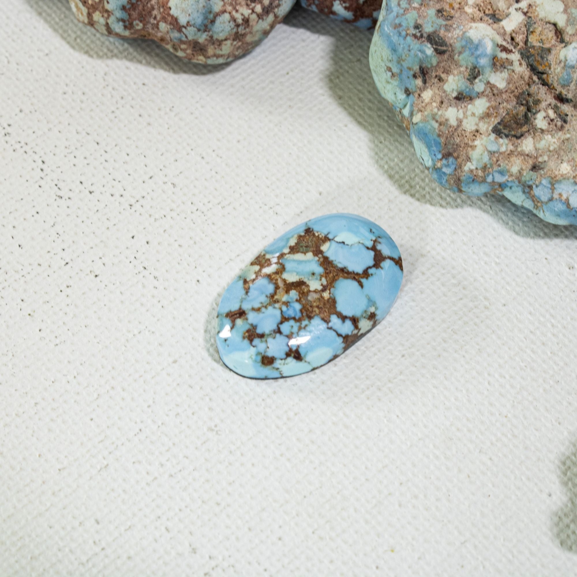 Golden Hill turquoise was first introduced to the U.S. around 2014. Mined in Kazakhstan, and only in the winter months, Golden Hill has become sought after and considered rare. It is a natural and chemically pure turquoise with colors that range from light blue to deep lavender. This is a beautiful presentation of Golden Hill lavender and blue color with the classic caramel matrix.