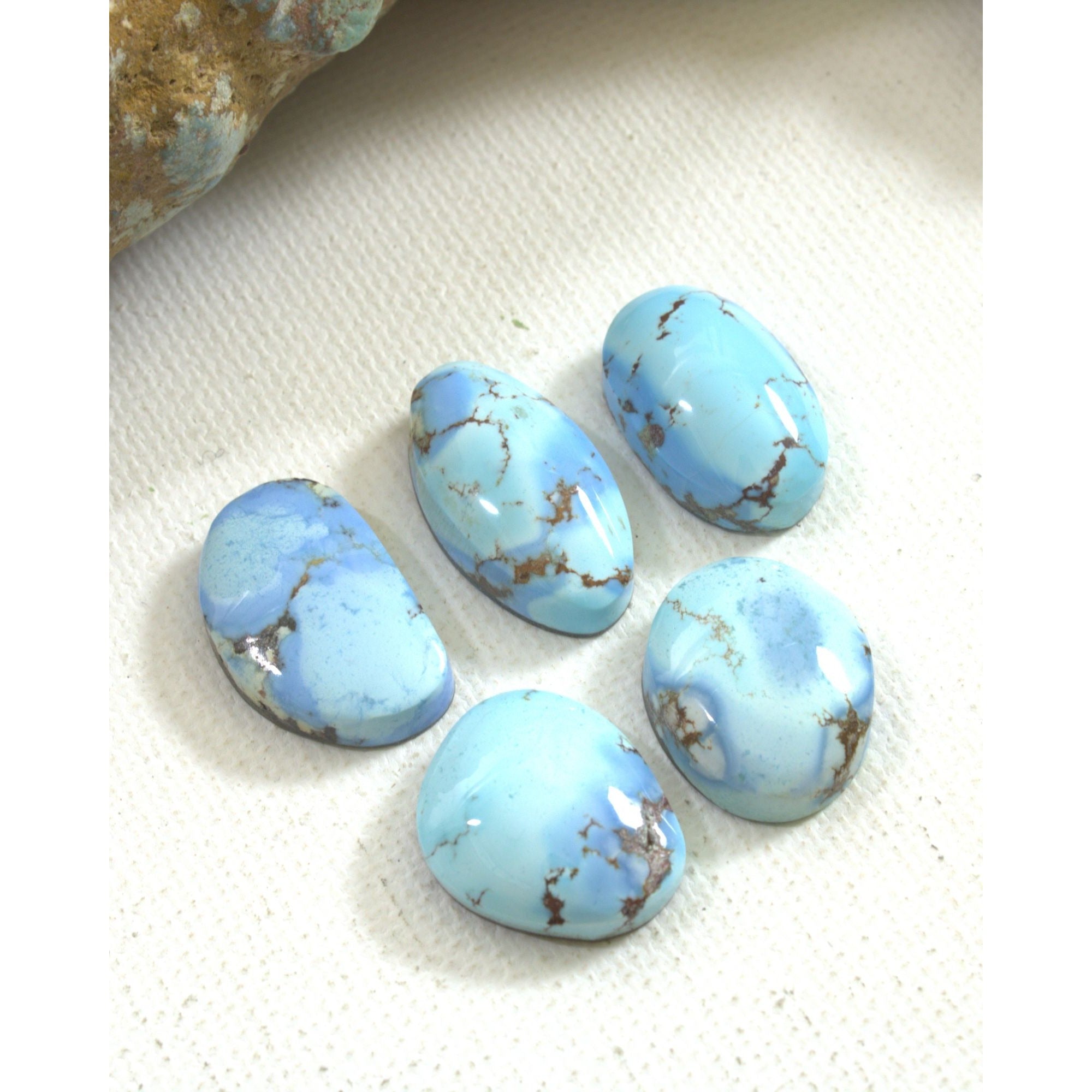 Golden Hill turquoise was first introduced to the U.S. around 2014. Mined in Kazakhstan, and only in the winter months, Golden Hill has become sought after and considered rare. It is a natural and chemically pure turquoise with colors that range from light blue to deep lavender. This is a 5 cab set assembled because of the shared deep blue Golden Hill lavender blue and similar golden matrix. Sets are an easy way to save money on Golden Hill cabs.