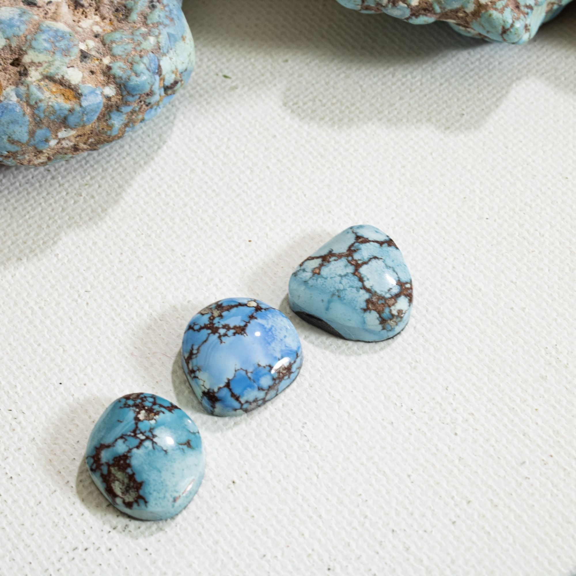 Golden Hill turquoise was first introduced to the U.S. around 2014. Mined in Kazakhstan, and only in the winter months, Golden Hill has become sought after and considered rare. It is a natural and chemically pure turquoise with colors that range from light blue to deep lavender. These Golden Hill cabs share a similar color pattern of classic Golden Hill lavender/blue and ticked with a golden matrix. Very pretty cabs.