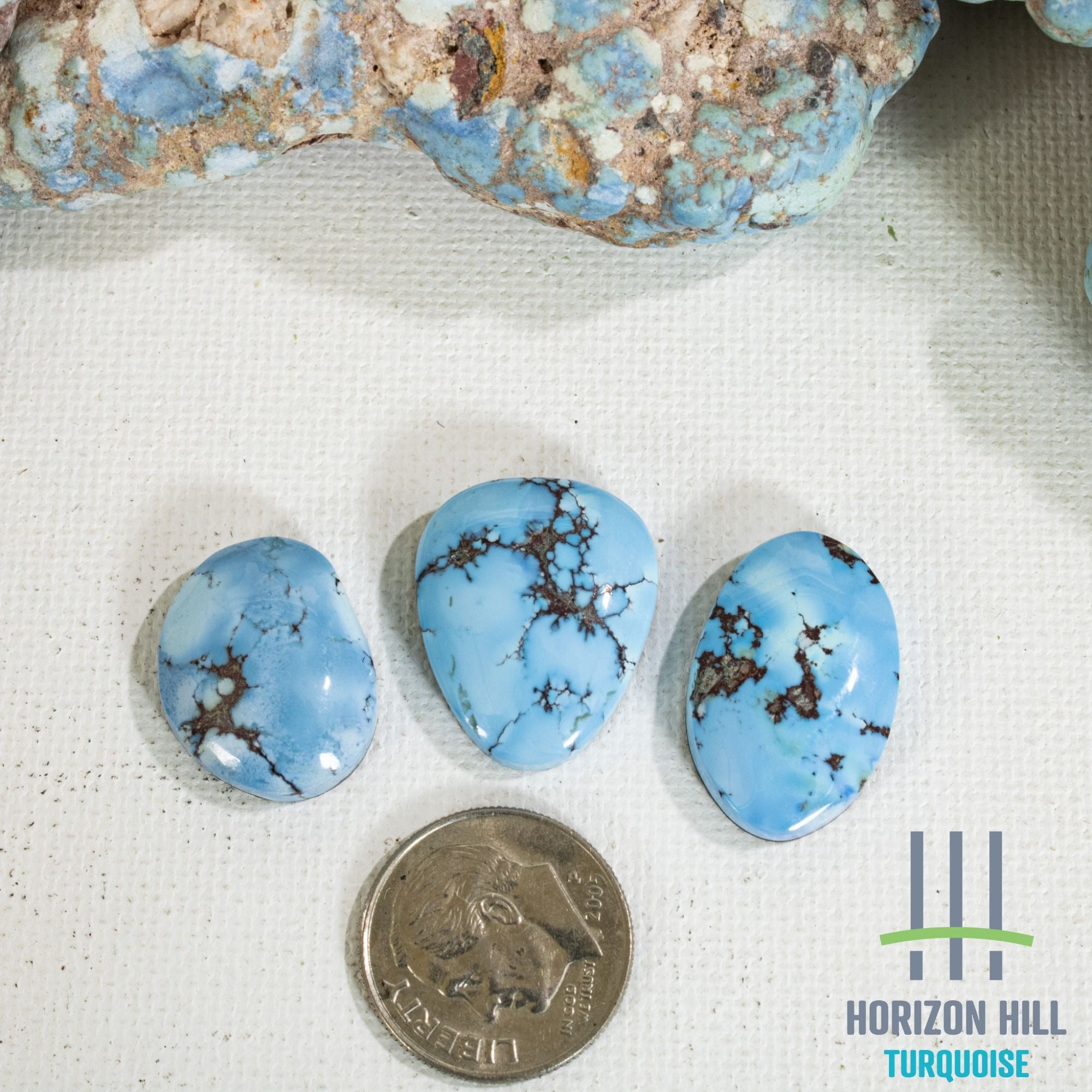 Golden Hill turquoise was first introduced to the U.S. around 2014. Mined in Kazakhstan, and only in the winter months, Golden Hill has become sought after and considered rare. It is a natural and chemically pure turquoise with colors that range from light blue to deep lavender. These Golden Hill cabs share a similar color pattern of classic Golden Hill lavender/blue and ticked with a golden matrix. Very pretty cabs.