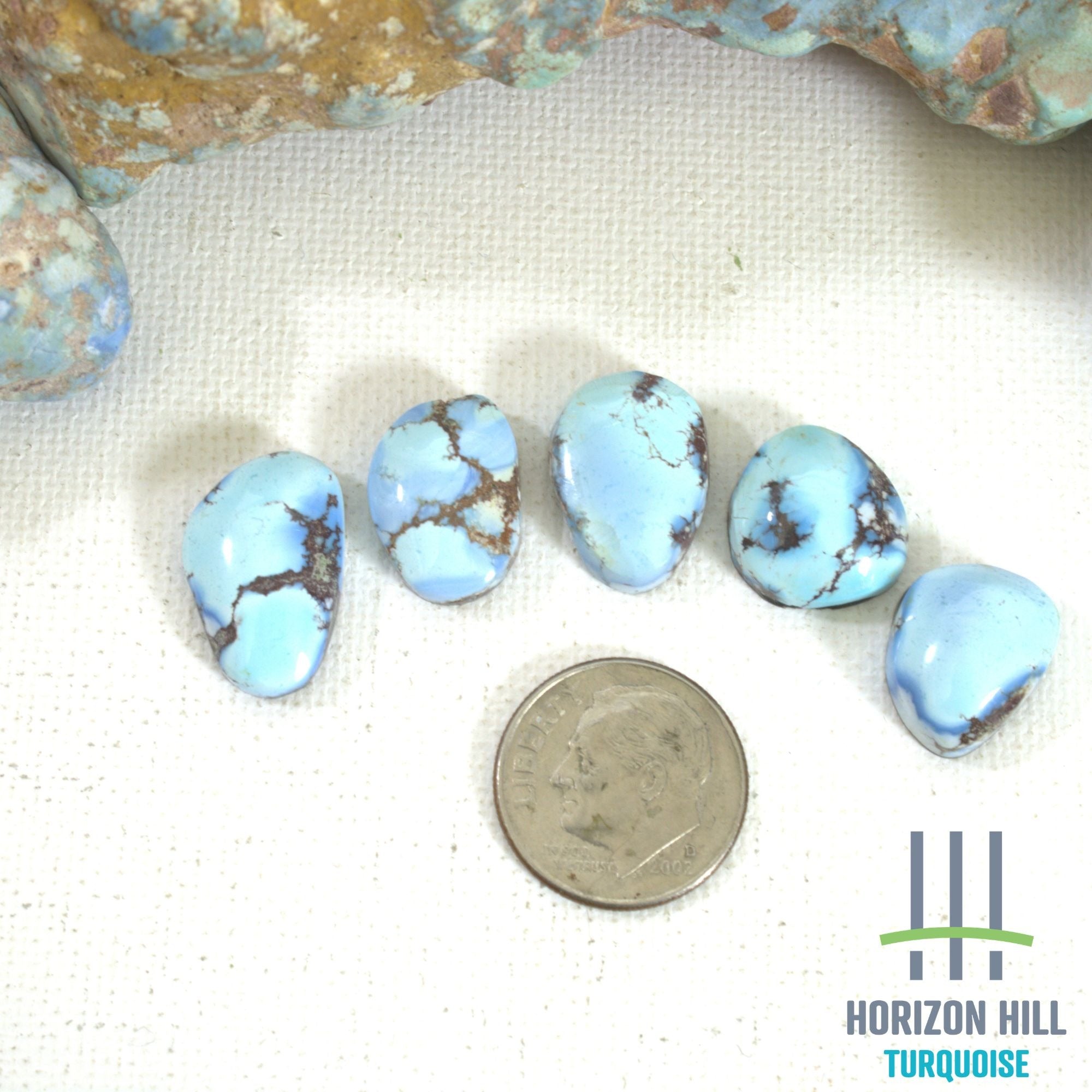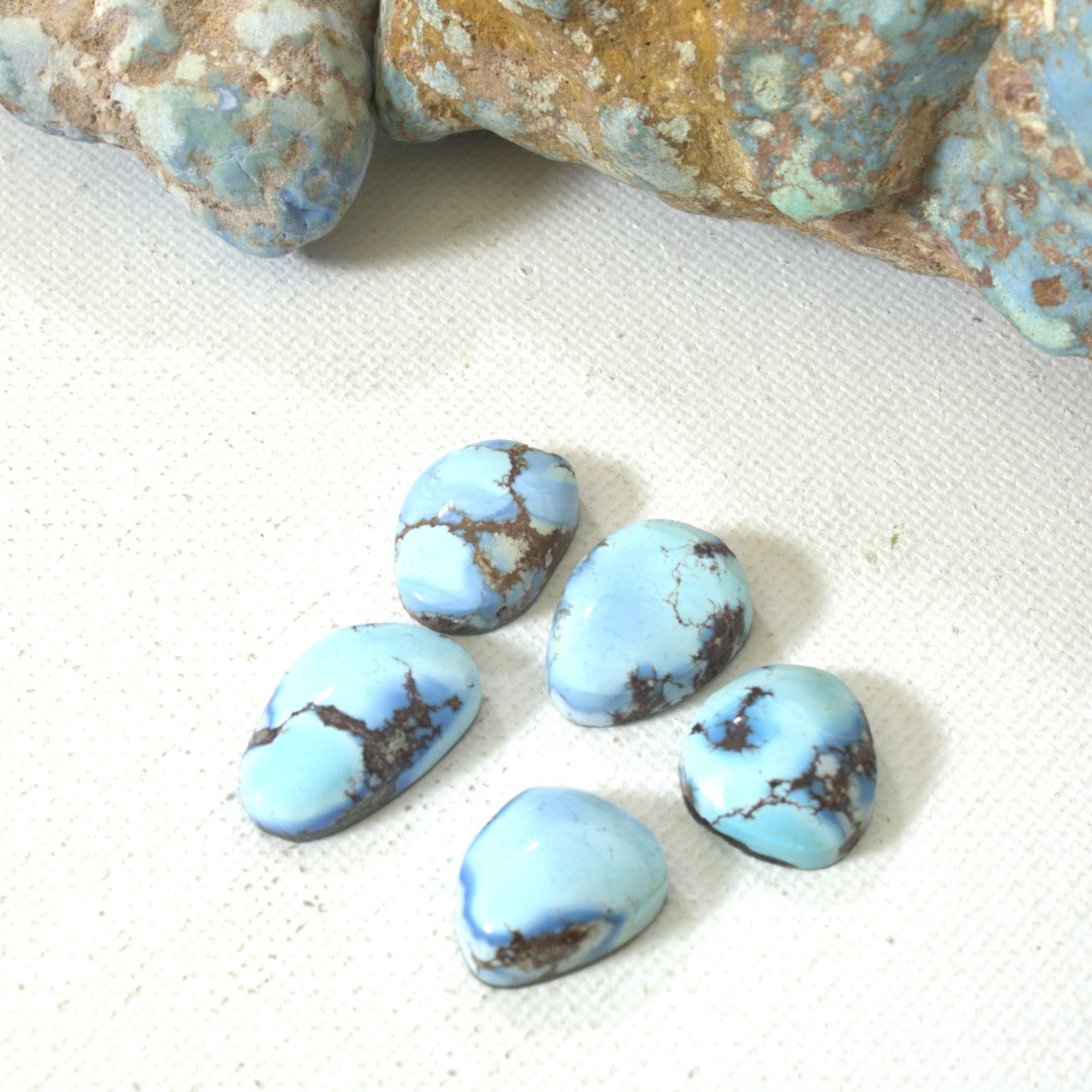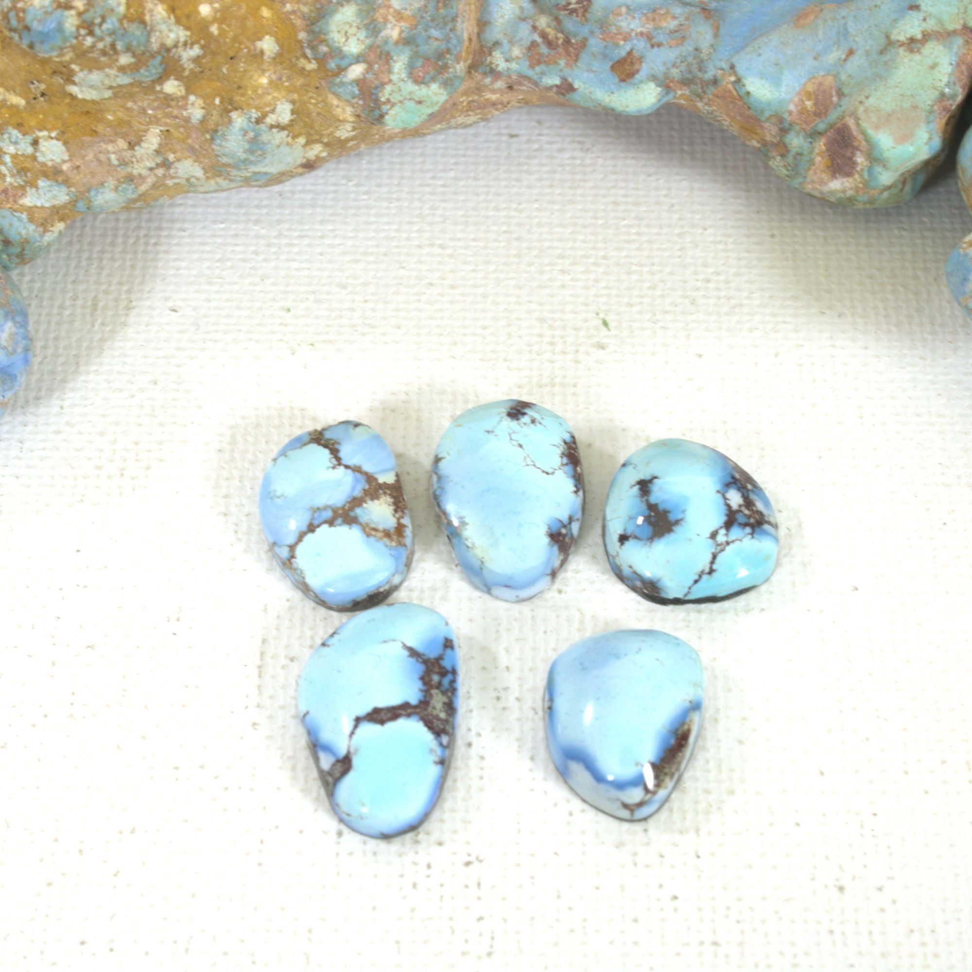Golden Hill turquoise was first introduced to the U.S. around 2014. Mined in Kazakhstan, and only in the winter months, Golden Hill has become sought after and considered rare. It is a natural and chemically pure turquoise with colors that range from light blue to deep lavender. This is a 5 cab set assembled because of the classic Golden Hill lavender blue and similar pronounced and distinctive dark matrix. Sets are an easy way to save money on Golden Hill cabs.